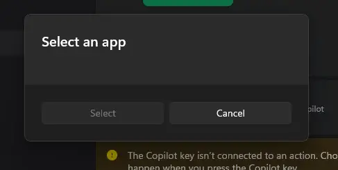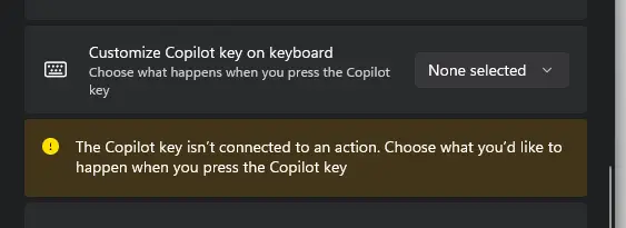"The Copilot key isn't connected to an action. Choose what you'd like to happen when you press the Copilot key"