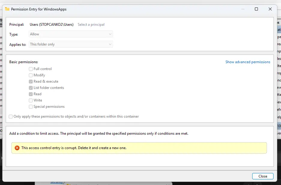 But since the rest of my "Windows Apps" seem to work fine, I'll have to just assume that "This access control entry is corrupt. Delete it and create a new one." actually just means "This is fine. 🐶☕🔥"