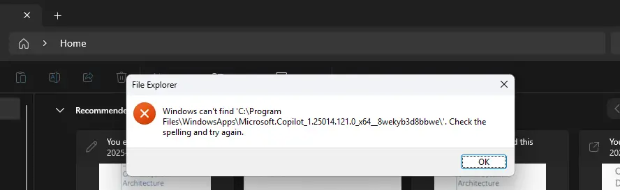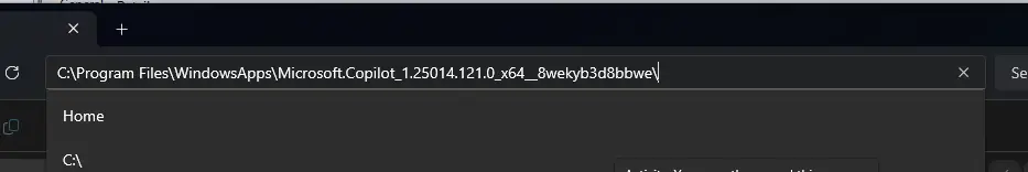 So CopilotNative.exe experienced a classic case of "application hang", around the time Windows uninstalled it. Let's take a look at the path "C:\Program Files\WindowsApps\Microsoft.Copilot_1.25014.121.0_x64__8wekyb3d8bbwe\CopilotNative.exe" - What's in that directory?