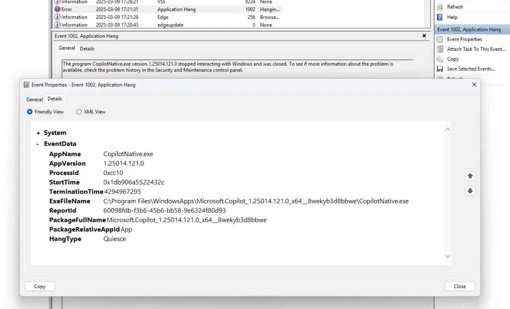 So my Copilot wasn't gone because of Windows Update. I want to know where it went, so I dug into the Application logs in Event Viewer - and literally the only line about Copilot was the one below:
