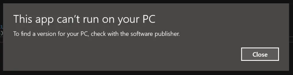 So, when running a build that includes some steps executed by node (either defined in your .csproj for your normal build definition, or as npm scripts to run with "npm run build" or similar command). But instead of the expected output - like, well, a build succeeding - you'll get a UWP-looking pop-up complaining about an app that can't run on your PC.