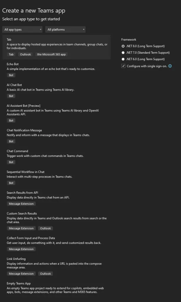 This article explains briefly what the different Microsoft Teams App templates in Visual Studio are for and what capabilities do they come with. It's a lot to wade through, but I hope this article is able to explain the basics.
