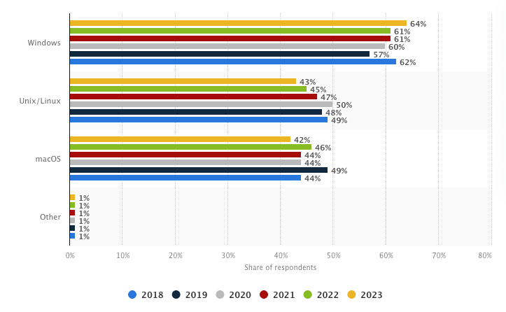 Unix/Linux came second with 43% (but dropping) and macOS third with 42% (keeping fairly stable).