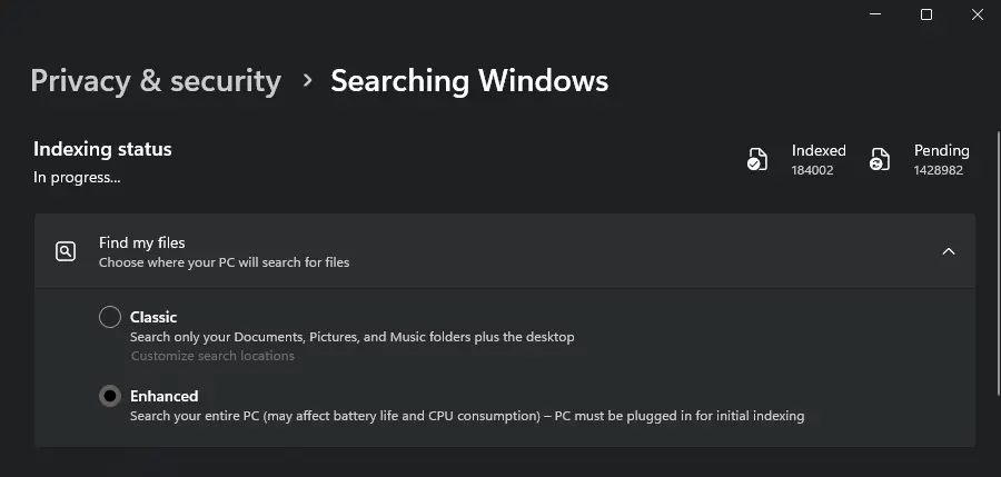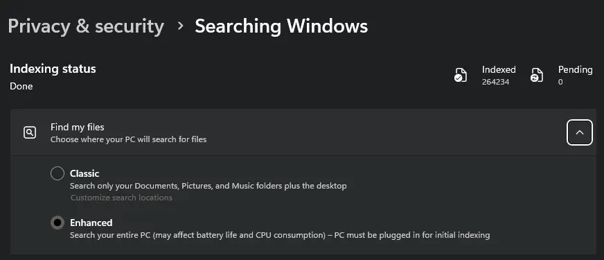 But I figured help is near - I could just switch Search to "Enhanced" mode, that (according to the UI) indexes the whole drive and will find all of my files.