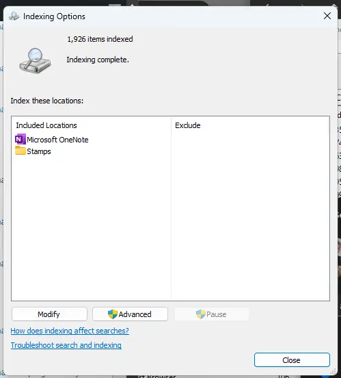 What's this then? I decided to head to Control Panel > Windows Search > Indexing options (apparently searching for Control Panel sections still worked!)