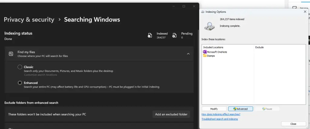 Spoiler alert: it wasn't. I guess it was just a more thorough indexing of "Microsoft OneNote" and "Stamps"!? Because it certainly wasn't all my files. It didn't look like it was ANY of my files, really!