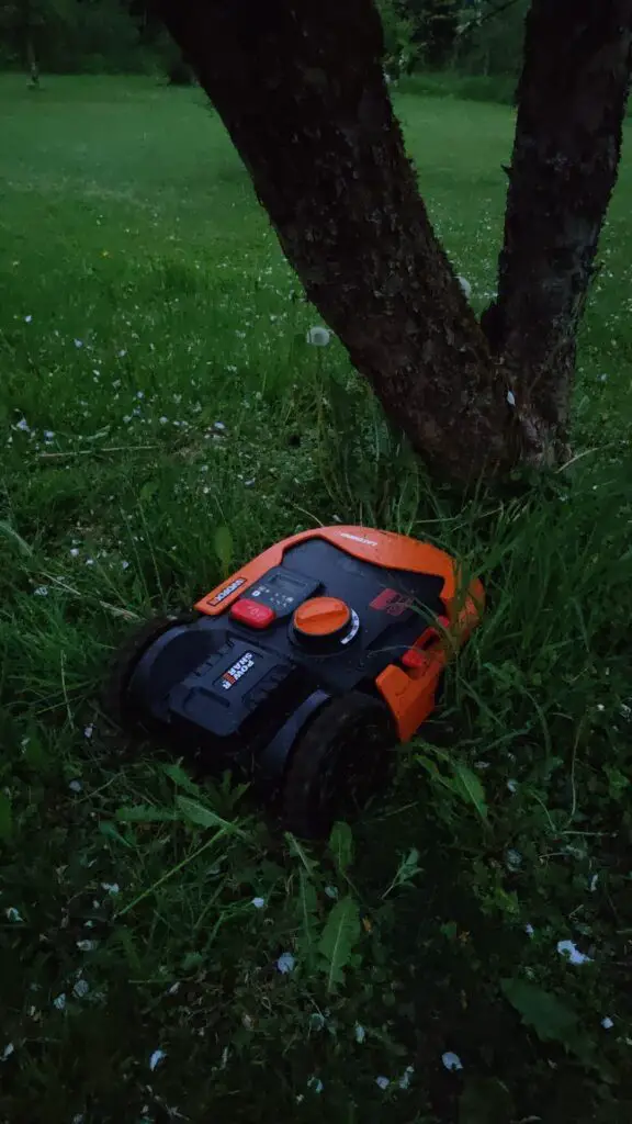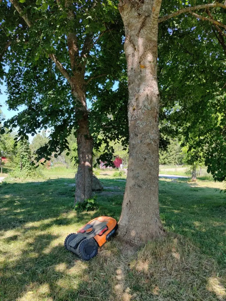 The robot doesn't care about making the grass around trees neat - it'll remain kinda grubby